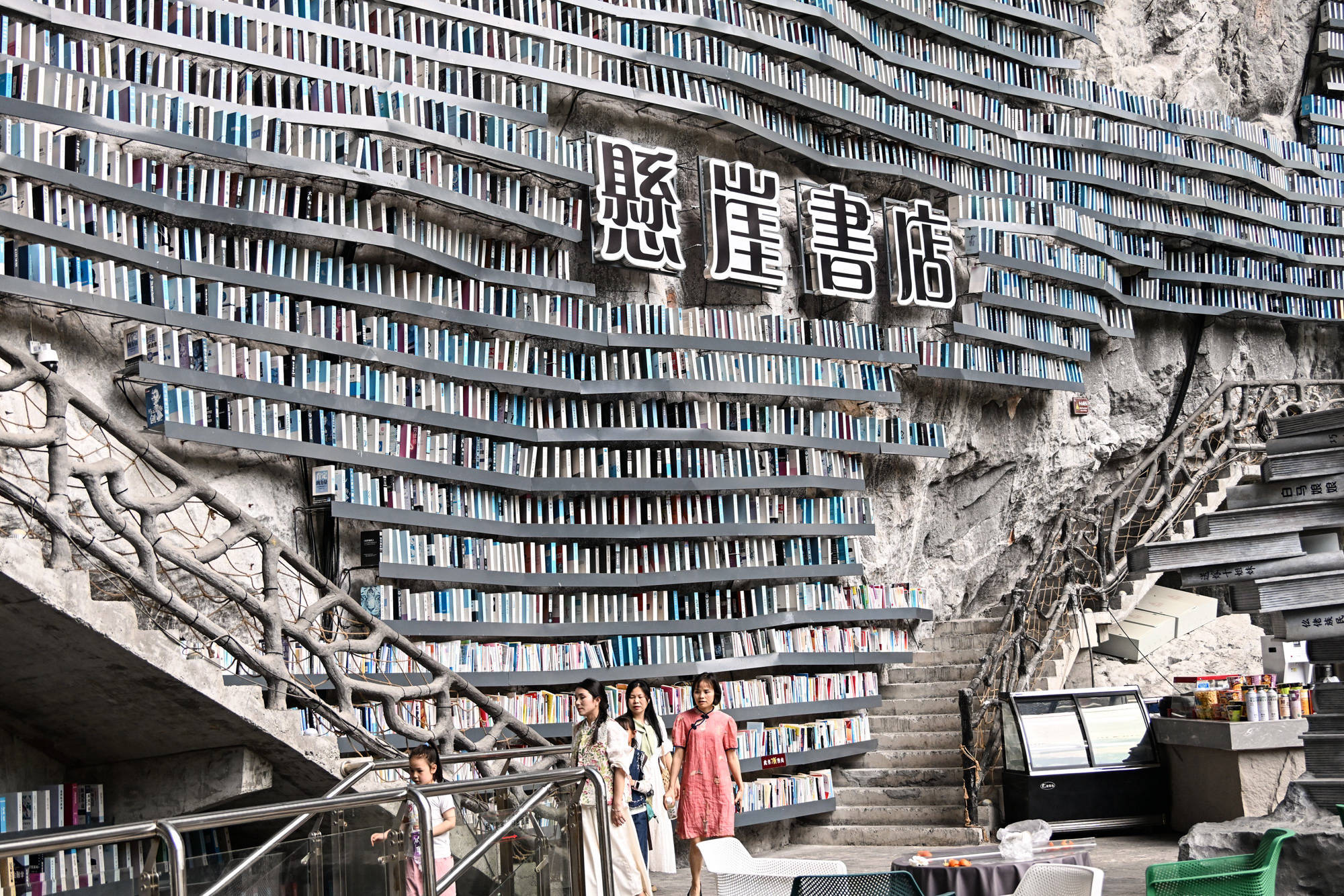 ↑2026年4月11日,人们在广西河池市罗城仫佬族自治县棉花天坑景区悬崖书店参观游览。CICPHOTO/韦如代 摄
