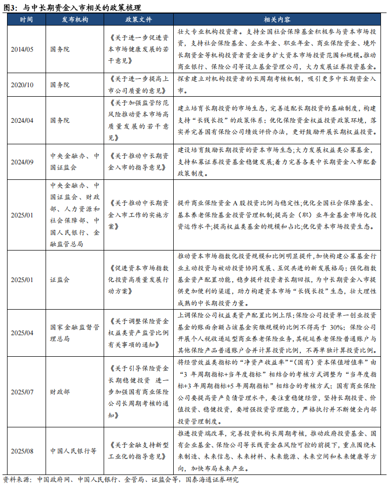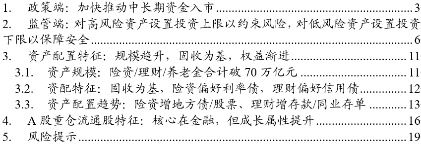 核心观点:我国险资/理财/养老金规模超70万亿且持续增长,资产配置呈“固收为基、权益渐进”特征。险资/社保重仓A股以金融为核心,同时逐步提升科技等成长领域配置。 ]article_adlist-->摘要 ]article_adlist-->▶政策端:加快推动中长期资金入市。2025年,《关于推动中长期资金入市工作的实施方案》发布,重点引导中长期资金进一步加大入市力度。这类资金期限长、对资本市场短期波动容忍度高,追求长期稳健回报,可发挥资本市场“压舱石”作用。资金类型主要包括商业保险资金、全国社会保障基金、养老金基金、理财产品等。