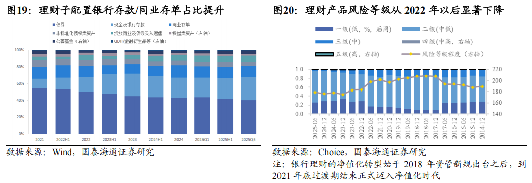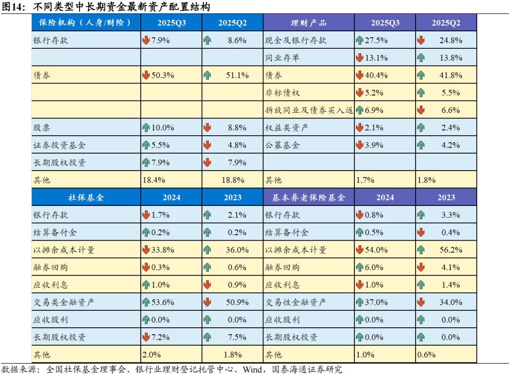 (3)理财产品:截至2025Q3,理财产品资产配置以固定收益类为主,投向债券、现金及银行存款、同业存单的占比分别为40.4%、27.5%、13.1%,且债券配置以信用债为主。权益类资产配置比例仅为2.1%。整体风险偏好显著低于社保基金和保险资金。对比2025Q2,理财产品在现金及银行存款上的投资占比提升,在债券、同业存单、非标债权、股票上的投资占比下降。