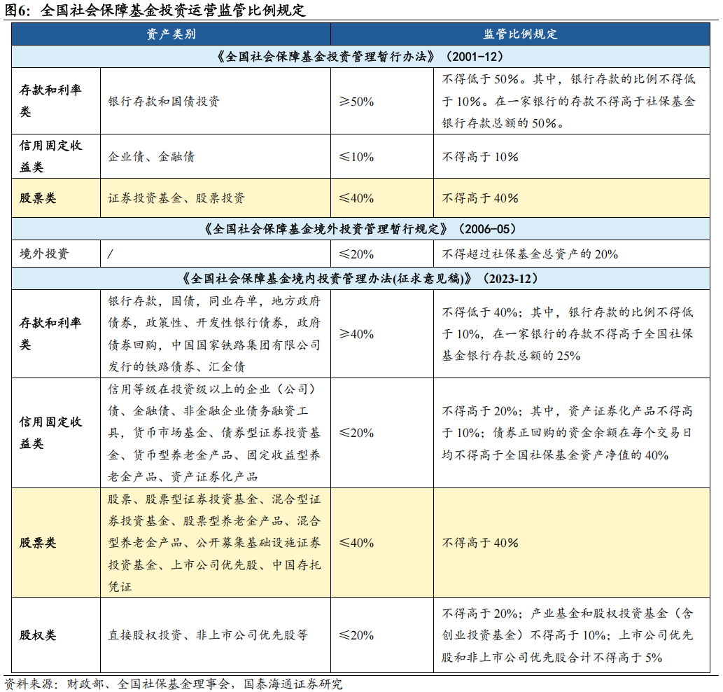全国社会保障基金投资运营坚持安全性、收益性和长期性原则,资产配置框架不断调整优化。2001年发布的《全国社会保障基金投资管理暂行办法》明确规定:银行存款和国债投资比例不低于50%,企业债和金融债投资比例不高于10%,证券投资基金和股票投资比例不高于40%。2023年发布的《全国社会保障基金境内投资管理办法(征求意见稿)》在延续稳健基调的同时,对资产分类与比例管理体系进行了系统性优化。其中,存款和利率类资产投资比例下限由50%降低至40%。信用固定收益类资产投资比例上限则由10%提升至20%,并新增股权类资产的投资比例上限为20%。并且,为适应金融市场发展,套期保值类工具也被纳入投资范围,明确社保基金可依法使用股指期货、国债期货、股指期权等衍生品。这些调整标志着社保基金在坚守安全边际的同时,正致力于构建一个更灵活、多元与现代化的资产配置体系。