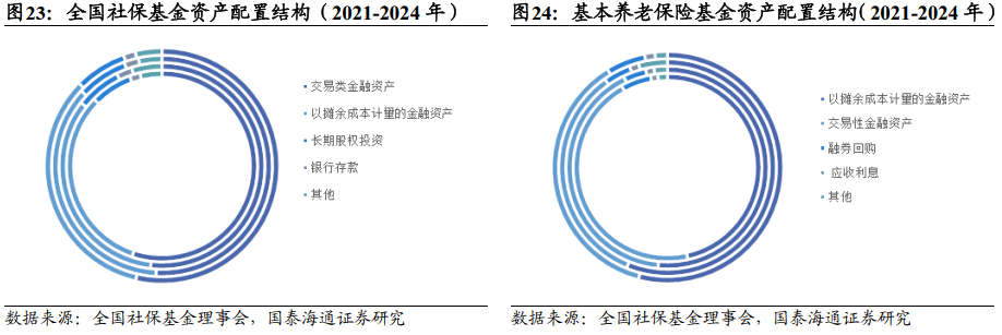 (3)社保基金与基本养老保险基金均在2024年提高了交易性金融资产的配比。从2021年开始,社保基金在交易性金融资产上的配比连降3年,到2024年上涨2.7%至53.5%;相反,以摊余成本计量的金融资产的配比则在连升3年后,到2024年下降2.2%至31.8%。基本养老保险基金在以摊余成本计量的金融资产上的配比连升3年,到2024年则下降2.1%至54.1%;相反,在交易性金融资产上的配比则在连降3年后,到2024年上涨3.2%至37.2%。