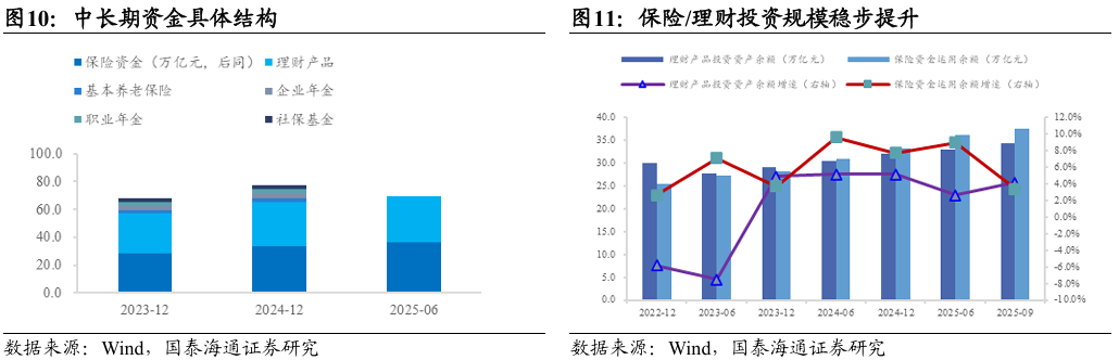 面对利率下降与优质“资产荒”的挑战,各类中长期资金积极调整资产配置策略,并因负债端久期与流动性约束而呈现出差异化的调整路径。(1)保险资金:持续巩固债券“压舱石”地位,并逐步向长期地方债与跨境债延伸;权益配比稳步提升,并通过私募证券基金与举牌等方式加速入市,整体呈现出“债券更追求性价比、权益配置趋强”的趋势。(2)银行理财:债券与非标债权配比大幅下降,现金/银行存款与同业存单等高流动性资产配比快速上升,权益敞口维持低位,公募基金配比小幅增加,整体呈现出“低波为先、流动为王”的防御特征。(3)社保与基本养老保险基金:在保持整体稳健配置框架的基础上,于2024年边际提升交易性金融资产配比,进一步增强组合灵活性与市场适应能力。