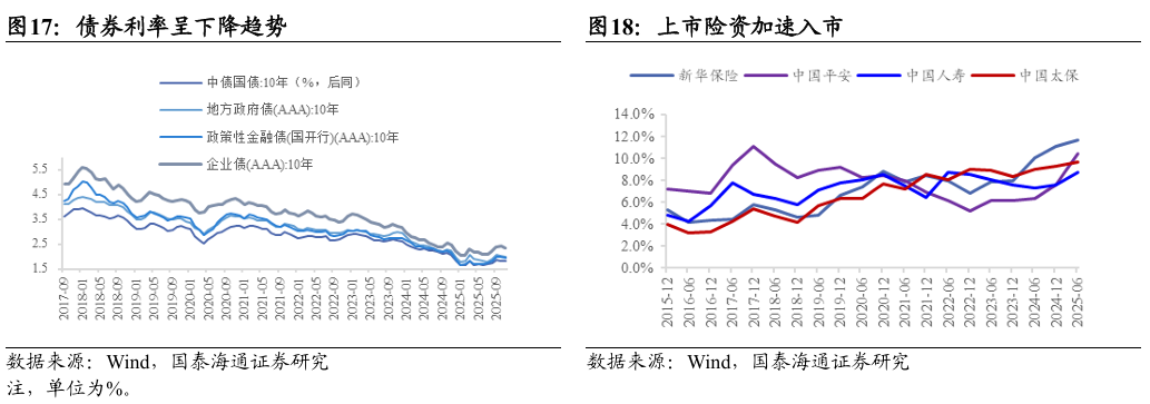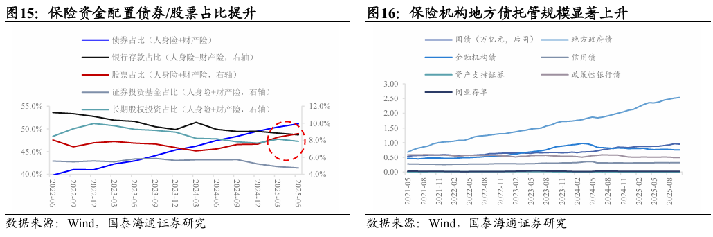 (1)保险机构:截至2025Q3,保险资金以人身险为主导,占比约90%,加上财产险二者合计达96%。在资产配置上,两资以稳健为主,债券配比高达50.3%,银行存款占比7.9%;权益类资产占比合计约23.4%,其中股票、公募基金和长期股权投资占比分别为10%、5.5%和7.9%。对比2025Q2,股票、公募基金投资占比提升,银行存款、债券投资占比下降。从中债登和上清所投资者托管数据来看,险资更偏好利率债,2025年10月占比达78%,其中50%为地方政府债,且其同比增速显著快于国债和政策性银行债。
