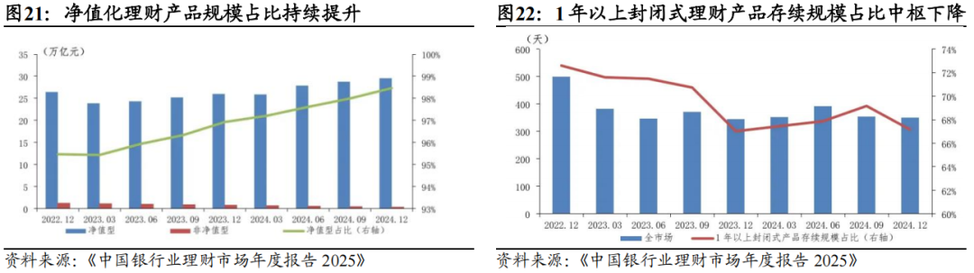 (2)银行理财:受负债端风偏束缚与渠道端低波导向,理财产品配置风格愈发保守,对高流动性资产的配比呈现新高。债券基本盘地位弱化,占比从2020年的64.3%降至2025Q3的40.4%,降幅高达23.9%。作为理财产品配置债券的绝对主力,信用债的配比也呈下降趋势,从2021H1的50.7%降至2025H1的38.8%。并且,信用债投资更侧重于高流动性、高评级的金融债,部分会在交易端运用期权等策略管理市场反转风险。信用债市场出现了“惜售”现象,且在银行间资金利率低位运行叠加债券供给持续偏紧的背景下,这一局面预计仍将延续。对比之下,现金及银行存款的配比却从9.05%上涨至27.50%,涨幅高达18.45%。同业存单配比则从2021H1的10.47%上涨至27.50%,涨幅高达13.10%。换言之,继保协存款被叫停后,理财资金在增配同业存款。除此之外,非标债权的配比也明显下降,从2020年底的10.9%降至2025H1的5.5%。权益类产品在整个理财市场中相当“小众”,配比也呈现出下降趋势,从2020年底的4.75%降至2025H1的2.4%。但同期公募基金配比从2.8%上涨至3.9%。背后反映出理财资金在尽可能尝试通过固收+的“+”端增配权益。上述资配调整策略带来的直接后果是理财产品收益率的走低。理财产品2025H1的平均年化收益率为2.12%,对比2024年的2.65%降幅达0.53%。后续伴随此前配置的相对高收益率资产陆续到期,理财产品未来收益预计面临挑战。