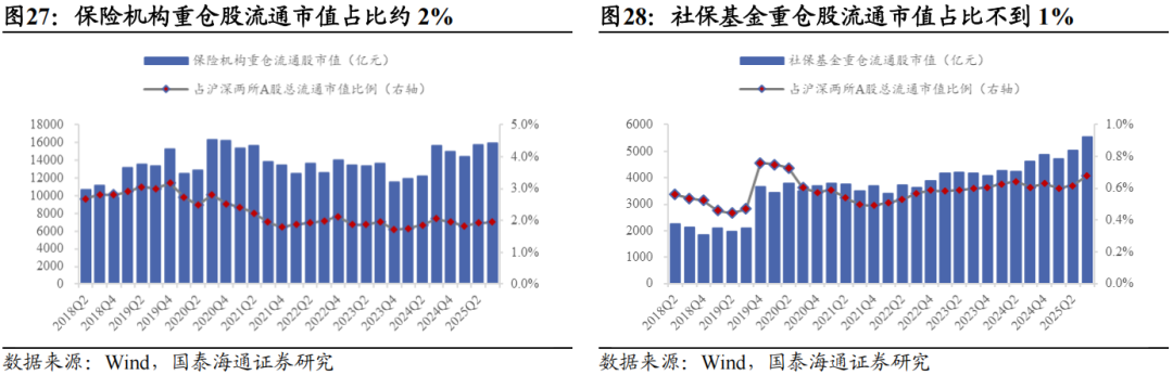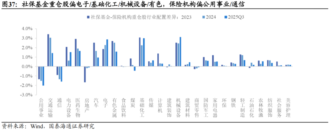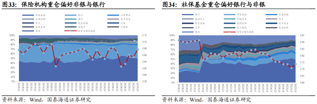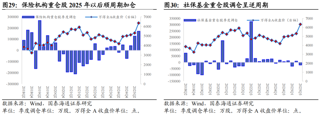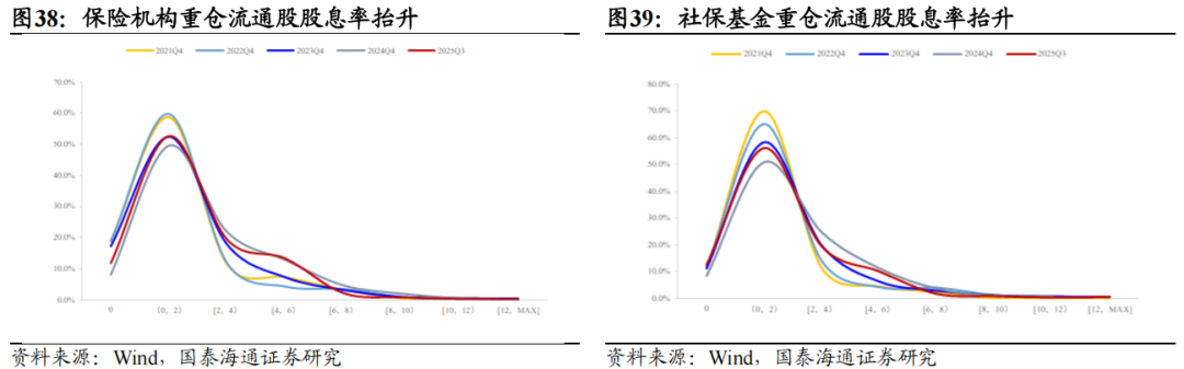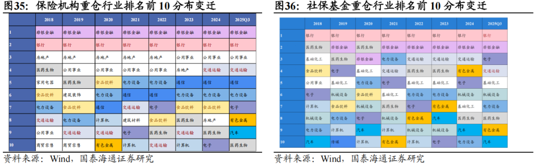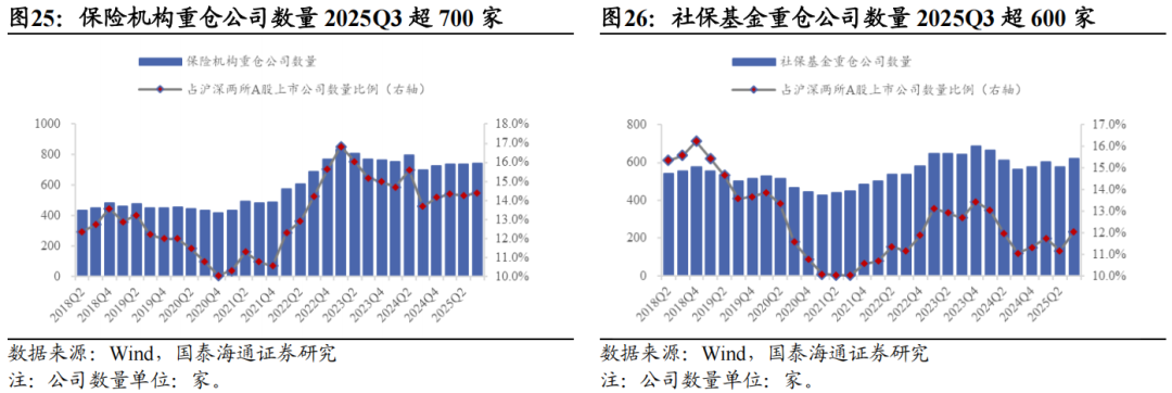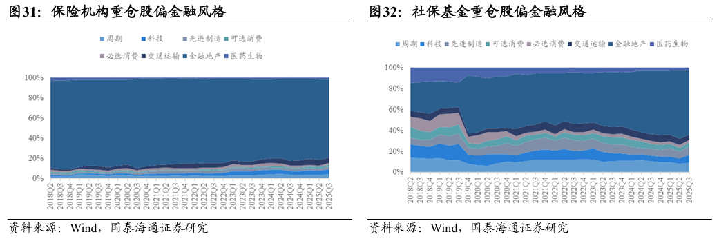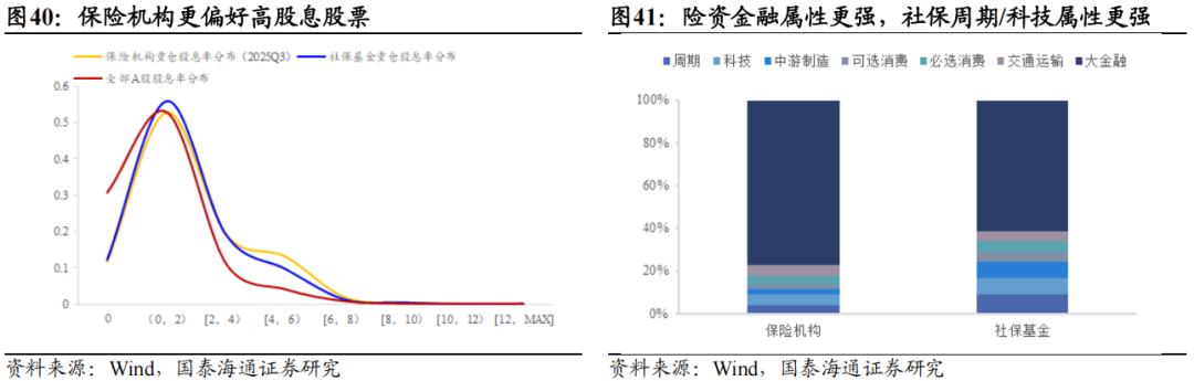 ▶A股重仓股特征:核心在金融,但成长属性提升。从Wind披露机构A股重仓流通股看,保险机构与社保基金的配置核心均为金融,但侧重点与延展方向明显不同。险资重仓广度更大、持仓结构更稳定,对非银金融的偏好长期突出,整体金融属性更强;社保重仓则在银行上的权重更高,重仓深度稳步提升。行业上,险资在非金融板块仍以稳健防御为底色,高股息偏好显著强于社保,但自2024年以来在通信、电力设备等科技与先进制造领域的敞口逐步提高,风格正从“红利-稳健”向“红利-稳健+成长”扩展。相较之下,社保基金的投资更具逆周期特征,非金融行业轮动更快,重仓股投资分散度明显高于险资,成长与周期属性更为突出。