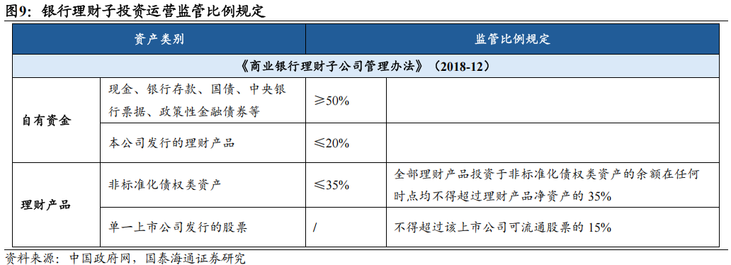 商业银行理财子公司的投资监管框架,严格区分为自有资金与理财产品资金两大范畴,实行风险隔离与分类管理。(1)自有资金对于存款和利率类资产的投资比例不得低于50%,以确保资本充足与运营稳健;同时,限制投资于本公司发行的理财产品的比例不得超过20%,有效防范利益冲突和风险内循环。(2)理财产品投资则侧重于信用风险与集中度管理。例如,对非标准化债权类资产的投资实行总量控制,要求全部理财产品持有的余额在任何时点均不得超过理财产品净资产的35%,以约束期限错配与流动性风险。