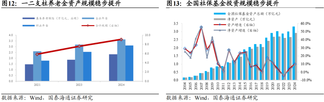 从资产规模看,若不考虑嵌套影响,涵盖险资、理财及养老金的中长期资金总体量已突破70万亿元。截至2024年末,涵盖保险、一二支柱养老金(含社保基金)及理财在内的中长期资金整体规模达到77.8万亿元,年度增幅为14.7%,其庞大的体量相当于同期沪深两市总市值的0.9倍,凸显了作为资本市场“压舱石”的关键作用。从结构上看,保险资金与理财产品构成双核心,规模均突破30万亿元,合计占比超80%;一二支柱养老基金(含社保基金)同期规模达12.4万亿元,同比增长16.8%。进入2025年,中长期资金增长势头延续。截至2025Q3,保险资金与理财产品规模进一步攀升至37.5万亿元与34.3万亿元,合计达71.9万亿元,较2024年末分别增长13%与7%。