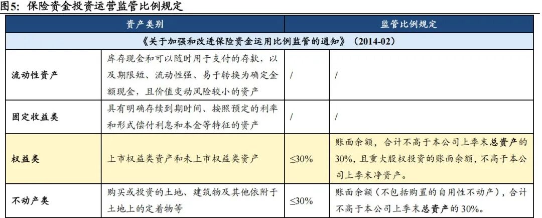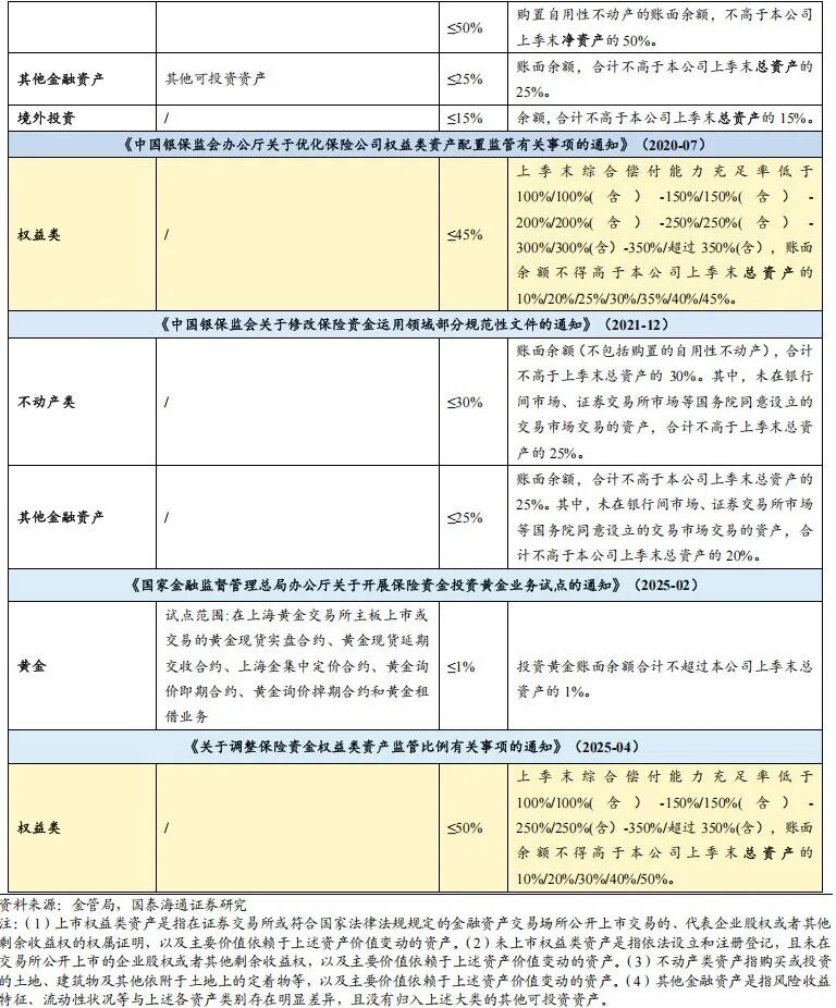 保险资金投资运营秉持安全稳健原则,权益类资产投资上限历经两次关键上调。2014年发布的《关于加强和改进保险资金运用比例监管的通知》首次以官方文件形式建立了保险资金运用比例监管框架。该框架依据资产风险收益特征,将保险资金投资资产划分为流动性资产、固定收益类资产、权益类资产、不动产类资产和其他金融资产五大类别,并分别设定各类资产投资总量及集中度的监管比例上限。彼时权益类资产的投资上限为30%。2020年,监管将权益资产配置比例上限与偿付能力充足率挂钩,并划分为7个档位,最高上限提升至45%;2025年,国家金融监督管理总局进一步将档位由7档简化为5档,并对部分档位比例上调5%,其中综合偿付能力充足率超过350%的公司,权益类资产投资上限最高可达总资产的50%。这标志着监管在坚守风险底线的同时,持续为优质险企拓宽权益投资空间。