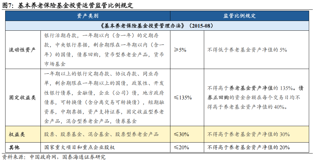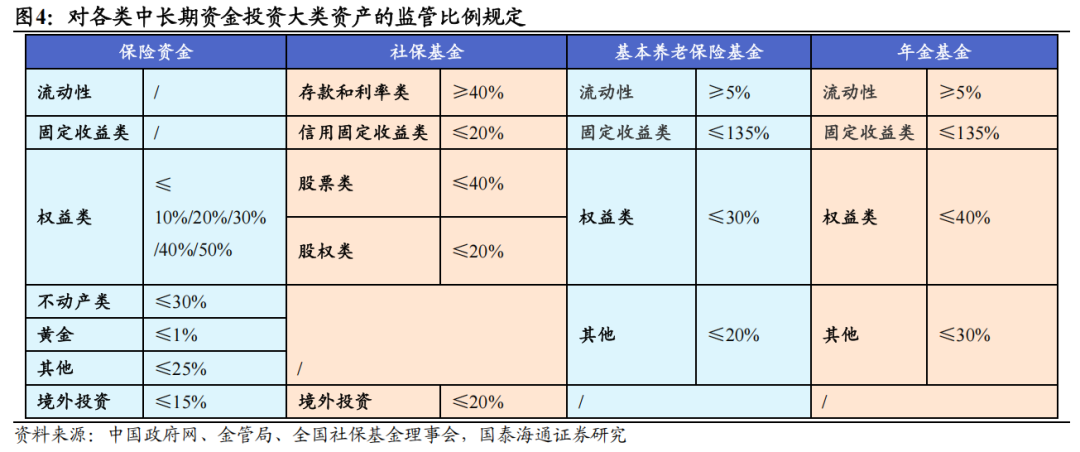 ▶监管端:对高风险资产设置投资上限以约束风险,对低风险资产设置投资下限以保障安全。我国对各类中长期资金的投资运用管理规定属于典型的数量型监管,即通过设定各类资产投资比例的上限或下限,以控制整体风险暴露并维护资金流动性安全。通常而言:(1)对风险较高的权益类资产设定投资比例上限。其中,保险资金投资上限与综合偿付能力充足率挂钩,最高可达50%;社保基金与年金基金为40%,基本养老保险基金为30%。(2)对风险较低、流动性强的资产类别则设定投资比例下限或不设限,以确保资金安全并与负债端匹配。其中,保险资金在流动性及固定收益类资产上的投资不设限;社保基金在存款及利率类资产上的投资下限为40%;基本养老保险基金与年金基金在流动性资产上的投资下限为5%。